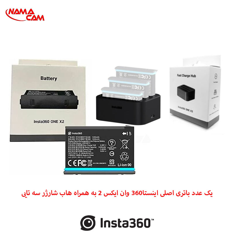 باتری و شارژر اصلی اینستا360 وان ایکس 2 دارای هاب شارژ سریع یک شارژر سه جایگاهی است .